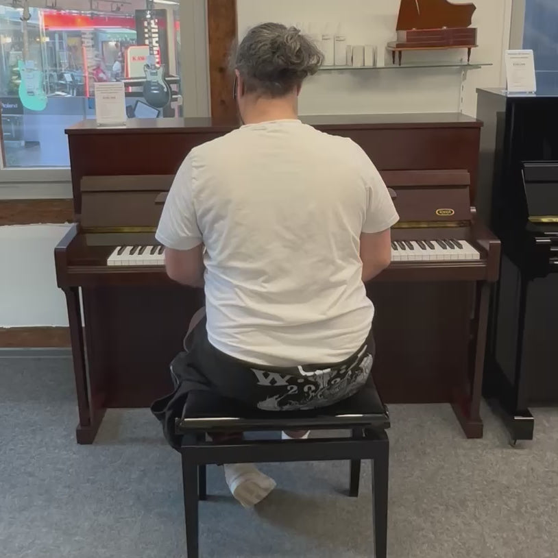 Die Oberfläche in Mahagoni poliert verleiht dem Klavier eine warme, luxuriöse Ausstrahlung. Dank seiner kompakten Bauweise passt es perfekt in jedes Wohnzimmer, ohne dabei an klanglicher Präsenz einzubüßen.