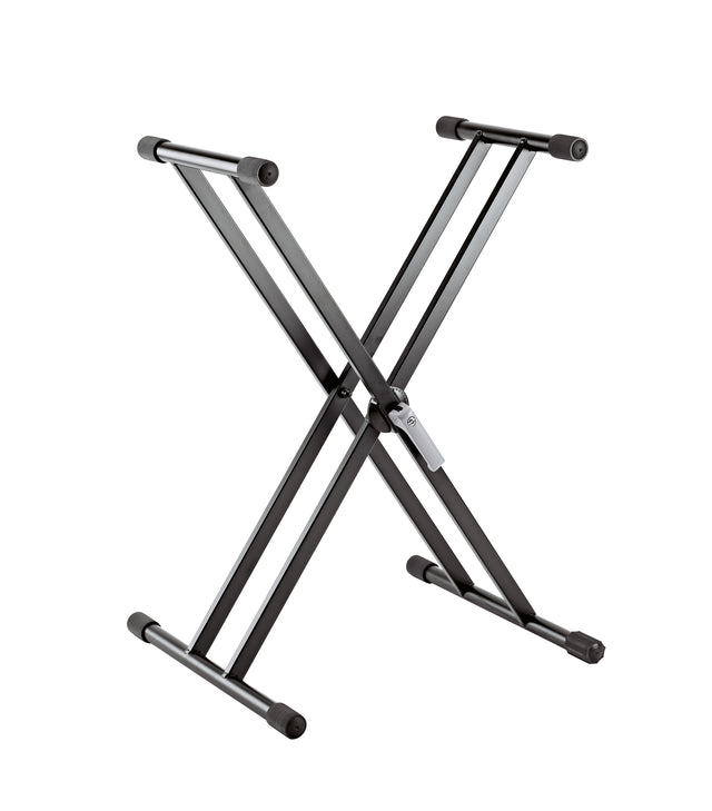 Extrem leicht und trotzdem äußerst stabil ist dieser X-Ständer aus Aluminiumrohren. Die Anordnung der doppelstrebigen Standrohre sorgt für spürbar mehr Stabilität und Sicherheit. Der ergonomische Klemmhebel ermöglicht ein schnelles und einfaches Aufstellen bzw. Zusammenklappen im Handumdrehen. Das robuste Metallgelenk ist mit 5° Schritten sehr fein verzahnt und ermöglicht so eine Vielzahl von verschiedenen Positionierungen. Anhand einer Skala kann man seine bevorzugte Aufstellvariante schnell wiederfinden. Die beiden hinteren Gummiauflagen sind axial verschiebbar und können somit perfekt an die Breite des Keyboards angepasst werden. Die max. Auflagentiefe beträgt 350 mm. Die K&M-typischen Qualitätsmerkmale wie solide Verarbeitung, hochwertige Oberflächenbeschichtung und ein praktischer Ausgleichsparkettschoner für Bodenunebenheiten runden das Gesamtkonzept ab. Mit dem Aufsatz 18941 ist dieser Ständer für ein zweites Keyboard erweiterbar.